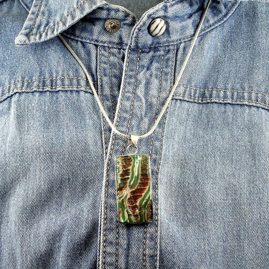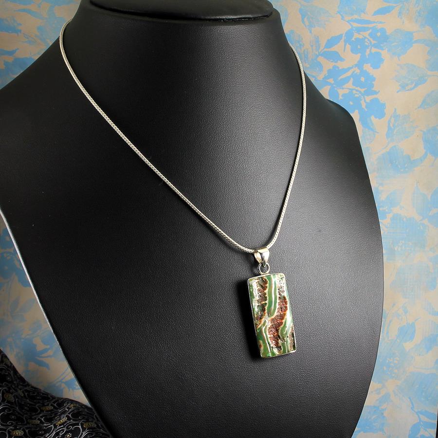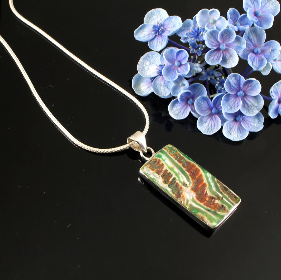 This stylish hand-crafted pendant features a dyed and polished green, brown and white Mother of Pearl Shell rectangle, fashionably set in a Sterling Silver 925 bezel tray