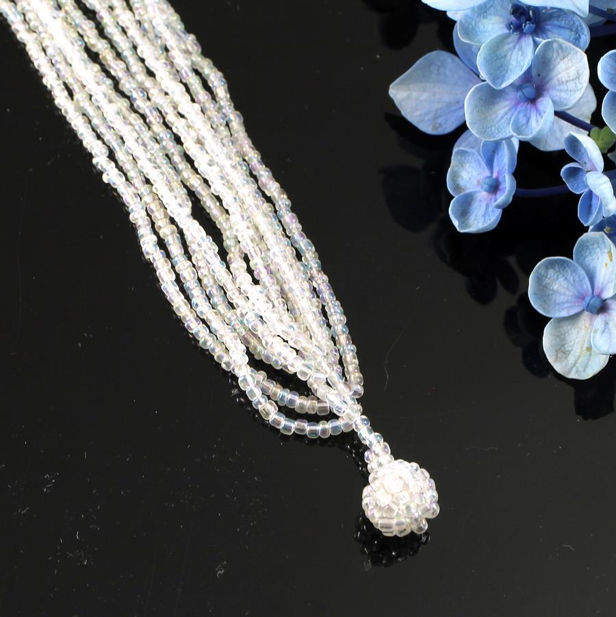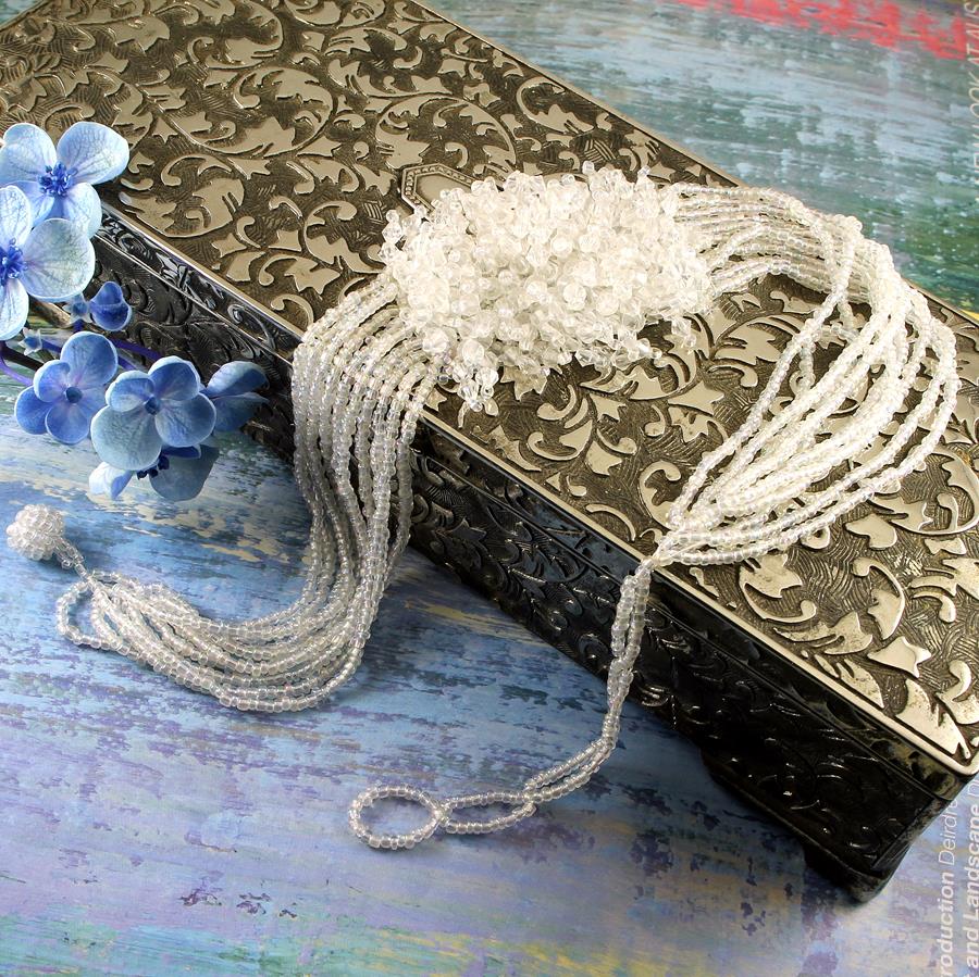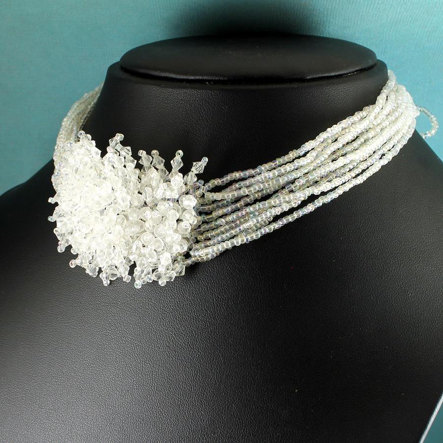 This subtly intricate vintage Torsade Choker – also wearable in Collar style – is visually centred around a large, dominant white floral-style rectangular cluster fashioned from white seed beads, and supported on each side by 10 fine strands of matching white beads